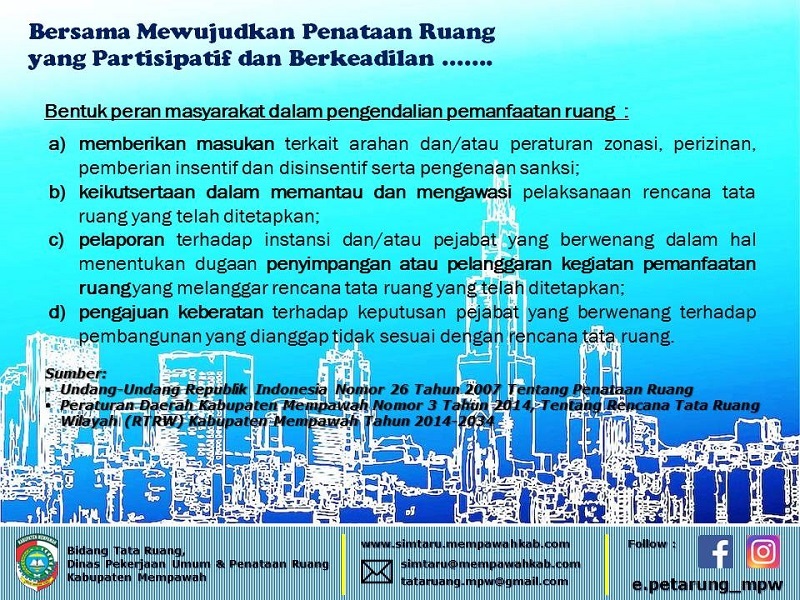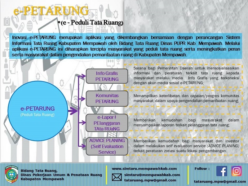 e-Petarung atau Elektronik Peduli Tata Ruang merupakan aplikasi peduli tata ruang berbasis web yang datanya terkoneksi dengan aplikasi Sistem Informasi Tata Ruang (SIMTARU) Kabupaten Mempawah.